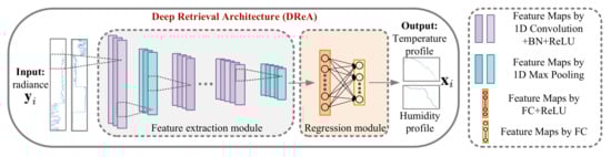 Schematic diagram of the deep retrieval architecture (DReA) which consists of two modules: feature extraction and regression modules. The feature extraction module is construed alternately using several one dimensional (1D) convolution, batch normalization (BN), rectified linear unit (ReLU), and 1D max pooling layers. The regression module is built by several FC and ReLU layers.