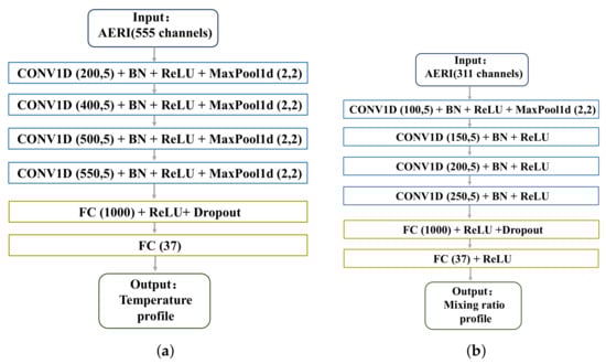 For the retrieval of the atmospheric temperature, the input to the DReA comprises 555 channels (constituted of 244 temperature sensitive channels and 311 water vapor sensitive channels) of data measured by the AERI instrument, considering that the water vapor absorption channels contain the vertical distribution information of temperature [42]. The feature extraction module of the proposed DReA has four 1D convolution layers: Conv1 (200 channels, 5 filters), Conv2 (400 channels, 5 filters), Conv3 (500 channels, 5 filters), Conv4 (550 channels, 5 filters). There are successively BN, ReLU, and 1D max pooling layers behind each convolution layer. Needless to say, the pool size is 2 and its stride is 2. The regression module of the proposed DReA includes two FC layers: FC1 (1000 neurons) and FC2 (37 neurons). The FC1 layer is followed by ReLU and Dropout. The FC2 is also the output layer. The detailed structure and its parameters are depicted in Figure 3a.