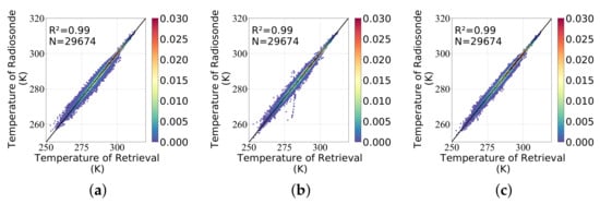 Linear description between the retrieval results of the temperature and the radiosonde measurements: (a–c) the scatter plot of the temperature for BP, EV regression, and DReA. The number of data points (N = 29,674) and the correlation coefficient are given. Colored areas show the density of data points: (a) EV regression; (b) BP; and (c) DReA.