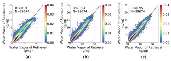 Linear description between the retrieval results of the water vapor mixture ratio and the radiosonde measurements. (a–c) The scatter plot of water vapor mixture ratio for BP, EV regression, and DReA. The number of data points (N = 29,674) and the correlation coefficient are given. Colored areas show the density of the data points. (a) EV regression; (b) BP; and (c) DReA.