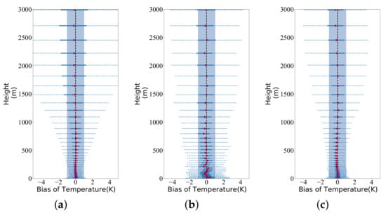 Temperature deviation with height: (a–c) inversion bias for BP, EV regression, and DReA. The means are shown as red dots and the medians are shown as blue carpetdots. The blue shadow means ±1 K bias of temperature. (a) EV regression; (b) BP; and (c) DReA.