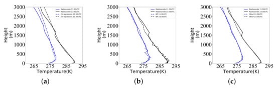 Specifically, Figure 9a–c show the temperature profiles of different methods at two moments (11:30 UTC and 23:30 UTC). The solid and dashed lines represent the value from the radiosonde and AERI inversion, respectively. Compared to the EV regression method, DReA shows only a tiny difference with the radiosonde data at the bottom layer. At 11:30 UTC and 23:30 UTC, between the heights of 2000 m and 3000 m, the EV regression method clearly deviates from the radiosonde data, and is not as good as our method. At altitudes below 1000 m, the temperature profiles from our method are much closer to the true values than those from the BP method. Overall, from one-day cases, we observe that the deviation of DReA is less than the deviation of the two other methods. Furthermore, the change in temperature throughout the day is well presented. This demonstrates that DReA has the superior ability to capture temperature changes over a day.
