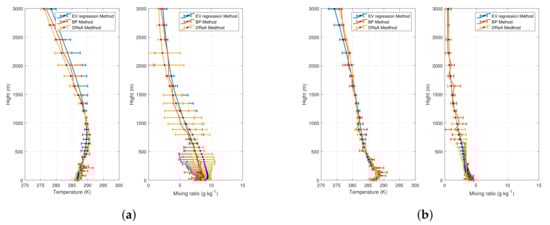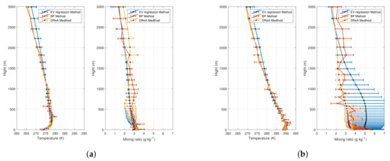 The error bar of the temperature and mixing radio on 29 January 2017 for EV regression, BP method, and DReA. (a) 11:30 UTC on 29 January 2017; and (b) 23:30 UTC on 29 January 2017.