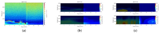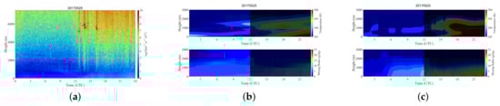 When a warm front crosses the border, the warm air mass takes the place of the former cold air mass, so the temperature and water vapor mixing ratio rise. According to this, an individual example of warm-air advection events is selected for analysis as shown in Figure 15. Figure 15a shows the vceil time–height cross-section for a warm-air advection event on 25 May 2017. Figure 15b presents the interpolated sounding time–height cross-section of the temperature (top) and mixing ratio (bottom) during the period. Figure 15c presents the period time–height cross-section of temperature (top) and mixing ratio (bottom) during the period. From Figure 15a, we find there are clouds mainly concentrated above 4000 m after 12:00 UTC. We therefore grayed out the contours after 12:00 UTC in (b) and (c). Results based on the unmarked gray fraction demonstrates that the temperature and mixing ratio trends can be broadly inverted by DReA.