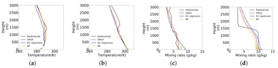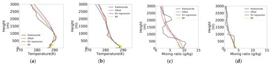 Comparison of the temperature (a,b) and mixing ratio profiles (c,d) at 11:30 UTC and 23:30 UTC on 25 May 2017 for a warm-air advection event. The black curve shows the radiosonde value. Furthermore, the blue, yellow, and red curves represent the inversion profiles of the EV regression, BP, and DReA method (a) 11:30 UTC; (b) 23:30 UTC; (c) 11:30 UTC; and (d) 23:30 UTC.