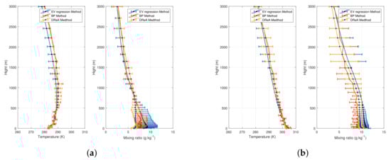 The error bar of the temperature and mixing radio on 25 May 2017 for EV regression, BP method, and DReA at a warm frontal passage: (a) 11:30 UTC on 25 May 2017; and (b) 23:30 UTC on 25 May 2017.