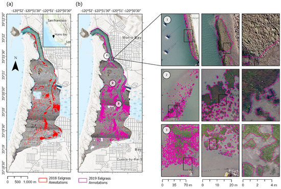 (Left) Human-annotated images of Morro Bay eelgrass habitats from (a) 2018 and (b) 2019. (Right) The three rows on the right highlight three regions of the estuary in 2019 at varying levels of zoom, as indicated by each inset. (1) Dense bed toward the mouth of estuary that is above water, appearing a light gray-green color; (2) partially submerged beds of varying size mid-estuary that are darker green and have some red-brown coloration and gleam off blades of eelgrass; (3) smaller, younger beds that are not submerged and appear lighter green in the images.