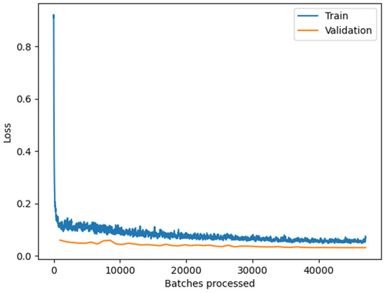 The training and validation loss graph of the DeepLab V3 model (Resnet 50). After processing the 200,000 training patches, training and validation losses are stabilized at the minimum, indicating that the model does not overfit the training dataset.