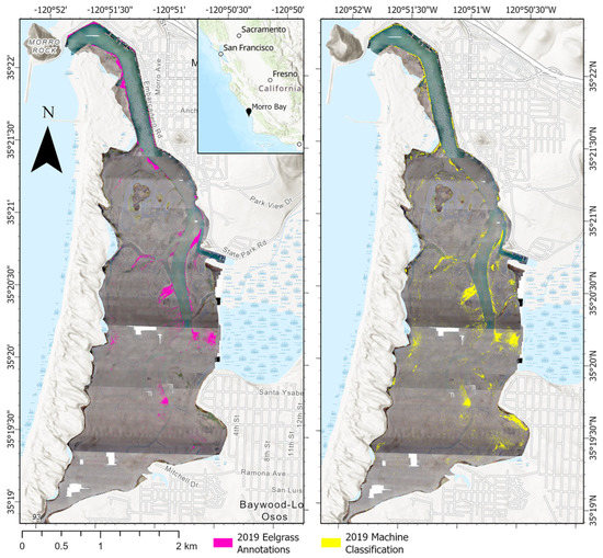 Although previous work has studied automatic or semi-automatic segmentation and classification of eelgrass (Z. marina) from drone-based data [16,17,18,32], this study is the first to our knowledge to evaluate the application of deep learning methods for this task. This is also the first study to our knowledge to evaluate automatic eelgrass delineation in the California Current at a high-resolution scale on the order of cm. We study eelgrass spatial habitat dynamics in the Morro Bay Estuary of California, an estuary that has undergone large declines and the subsequent recovery of eelgrass over the past decade [17,33,34]. Furthermore, this work is unique in that we evaluate the potential of longitudinal analysis for the study of eelgrass spatial dynamics by training the classifier on data from one year and evaluating its ability to identify eelgrass in data from the next year.