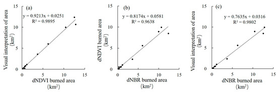 Figure 6a demonstrates a high degree of consistency between the burned area extracted using the dNDVI and visual interpretation, with an R2 value of 0.9895, indicating a strong agreement between the two variables. Similarly, Figure 6b shows a strong coefficient of determination of 0.9638 between the burned area extracted using the dNBR and dNDVI. Figure 6c with an R2 value of 0.9802 between the burned area extracted using dNBR and visual interpretation. Overall, these results suggest that all three methods are reliable for extracting burned areas, as they exhibited high consistency across the board.