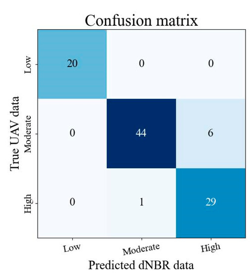 In this study, we compared 100 field sampling points of different severities with the dNBR classification level (Figure 3) to verify the accuracy of this threshold classification range (Table 2). The classification results were assessed using a confusion matrix to verify the accuracy and reliability of the classification, as illustrated in Figure 7. No errors occurred at the low severity, but slight errors occurred at moderate and high severities. The overall accuracy was 93%, with a kappa coefficient of 0.8889. These results indicate the field sampling points were highly consistent with the results of the fire severity classification, and the threshold values had been set precisely.