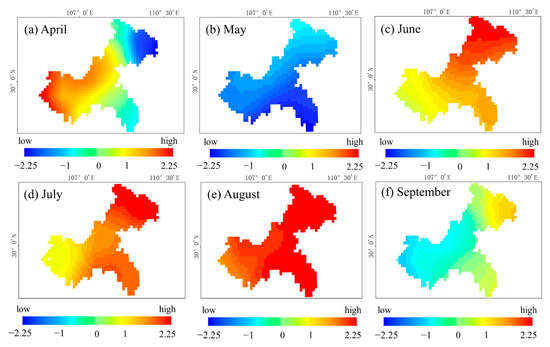 Figure 13 shows a diagram of the SSMI for Chongqing from March to October 2022. In March, the precipitation in Chongqing was normal. The rainy season started in April and the SPI indicated positive values ranging from −0.14 to 3.56. The precipitation in the area started to decrease in May. During July and August, the SPI values were relatively low in most of the study area, thus indicating a drought event in the region. In September and October, the severity of drought in Chongqing eased.