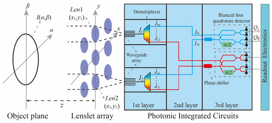 The “checkerboard” imager shown in Figure 1 is a classic structure of the photonics integrated interference imaging system. The lens array of the “checkerboard” imager is set in a square grid arrangement. These lenses are divided into four groups: , , , and . The lenses in each group are paired according to the central symmetry. This arrangement and pairing method can achieve uniform spatial frequency sampling in two orthogonal array directions and has better imaging results [25]. The imager uses three layers of PIC arrays. The first layer of 2D PIC after the lens array is designed with waveguide arrays and demultiplexers to split light. The second layer of 3D PIC is designed with phase shifters and balanced four quadrature detectors to transmit and match the light of each pair of lenses, bands, and sub-field. The third layer of 2D PIC is used for interferometry.