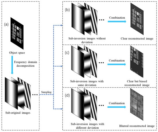 As shown in Figure 3a, the object space can be regarded as the superposition of sinusoidal fringes after frequency domain decomposition. The imaging process of the imaging system is equivalent to the discrete sampling of these sinusoidal fringes; calculate the sub-inversion image with displacement and superimpose them to form a reconstructed image.