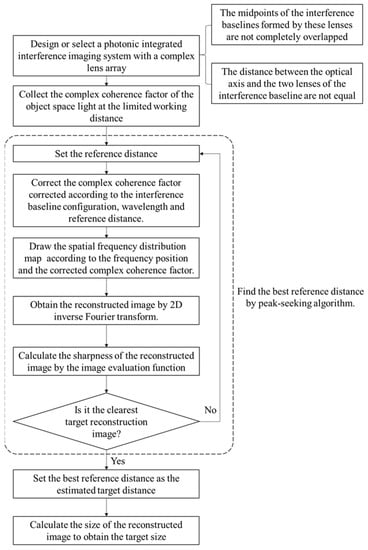 According to the previous analysis, we can use a photonics integrated interference imaging system with a complex lens array to collect the complex coherence factor of the object space light at the limited working distance. The midpoints of the interference baselines formed by these lenses are not completely overlapped. The distance between the optical axis and the two lenses of the interference baseline are not equal. Thus, we use the image evaluation function to analyze the relationship between the sharpness of the target image and the reference distance. Next, we set the best reference distance to make the target reconstructed image clearest as the distance of target and calculate the size of the sub-FOV: , . We take them as the actual size of the reconstructed image and calculate the target size according to the relative position of the target in the reconstructed image. The size accuracy is positively related to the positioning accuracy of the distance. The working flow chart of the 3D positioning imaging is shown in Figure 4. This method is a passive visual 3D imaging method with a single camera and single exposure.