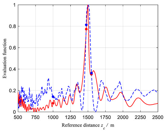The reconstructed image when is shown in Figure 6a. The reconstructed image with correction using the actual distance as reference distance is clear because the deviation of each sub-inversion image is eliminated. Then, changed from 500 m to 2500 m to obtain the corresponding reconstructed images, and the reconstructed images when the value of is set to 1000 m, 1475 m, and 1550 m, respectively, are shown in Figure 6b–d. The normalized result of evaluating each reconstructed image using the evaluation function of sharpness based on the Laplace gradient function is shown by the dotted blue line in Figure 7. The normalized result of evaluating each reconstructed image using the evaluation function of sharpness based on the negative value of SSIM of the reconstructed image and the filtered image after removing the highest frequency is shown by the solid red line in Figure 7. Two evaluation functions show good unimodality. Set a search region with a certain step length near the peak, calculate the maximum value position within this region, and then set a smaller region and step near the maximum position of this region. Repeat the search process until the region length is less than 0.01 m to obtain the best reference distance. The best reference distance of evaluation functions based on gradient and SSIM are 1501.91 m and 1496.48 m, respectively. Taking 1501.91 m as the estimated distance of the target, combined with the working wavelength and the minimum baseline, the size of the reconstructed image is .