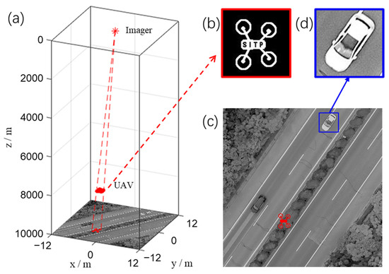 The scene of 3D imaging simulation. (a) The spatial position of the imager, UAV, and ground. (b) The shape of UAV. (c) The image of ground with a red area which is the projection of the UAV. (d) The image of the “car” area.