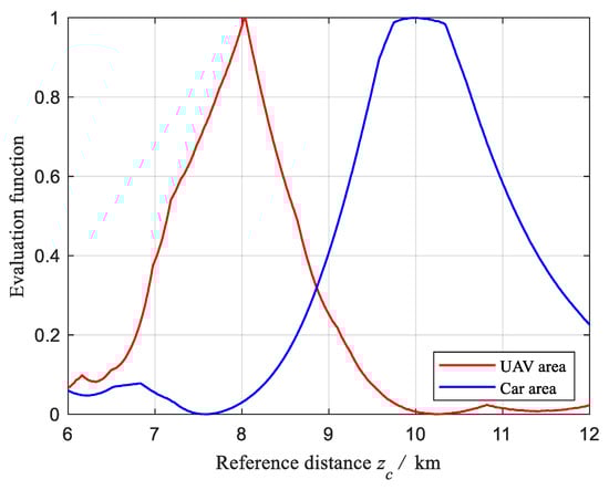 Following the same simulation process, the reconstructed images are obtained based on the reference distance varying from 6 km to 12 km. The reconstructed images of the UAV area and the “car” area are evaluated based on the Laplace gradient function, and the results are shown in Figure 9. Use interval search algorithm and take 1 m as the target precision. The best reference distances for them are 8.034 km and 9.997 km, respectively. The reconstructed images when the reference distance is 8.034 km and 9.997 km are shown in Figure 10a and Figure 11a, respectively. When the reference distance is set to 8.034 km, the reconstructed image of the ground part is blurry and has fringes, which is caused by the incorrect correction of the collected signals. When the reference distance is set to 9.997 km, the ground part is clear, and only the UAV are is affected. Figure 10b and Figure 11b show the reconstructed image of the “car” area. Figure 10c and Figure 11c show the reconstructed image of the UAV area. The UAV in the reconstructed image is clear, but the car is not clear when the corrected distance is close to the actual distance of UAV. In addition, the car in the reconstructed image is clear, but the UAV part is not clear when the corrected distance is close to the actual distance of the ground. Take 8.034 km as the distance of UAV. According to the relative position of the UAV in reconstructed image, its size is calculated as 1.80 m × 1.44 m, and the coordinate of its center point is calculated as (−2.20 m, −4.02 m, 8034 m). Take 9.997 km as the distance of the ground. According to the relative position of the “car” area in the reconstructed image, the coordinate of its center point is calculated as (3.96 m, 9.82 m, 9997 m), and the length of the car is calculated as 2.83 m.
