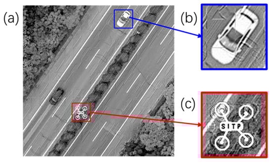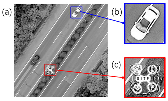 The simulation results of (a) the reconstructed image, (b) the “car” area and (c) the UAV area when the reference distance is 8.034 km.