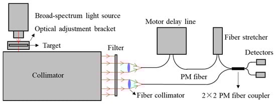 The optical fiber system is used for a verification experiment. As shown in Figure 12, the lights emitted by a broad-spectrum light source (Thorlabs OSL2IR) pass through the target. Then, the lights are collimated by the collimator with a focal length of 2.27 m and filtered by the filter with a filtering range of 1550 nm ± 20 nm. Two fiber collimators with a distance of collected the lights. One ray of lights passes through the motor delay line and the fiber stretcher, and then interferes with the other ray of lights through 2 × 2 optical fiber coupler. The fiber stretcher with large range and step length is used to initially find the equal optical path position, and the motor delay line with small range and step length is used to scan the interference curve near the equal optical path position. Finally, the detectors are used to collect two interference signals with opposite phase after interference. The image of the experimental equipment is shown in Figure 13.