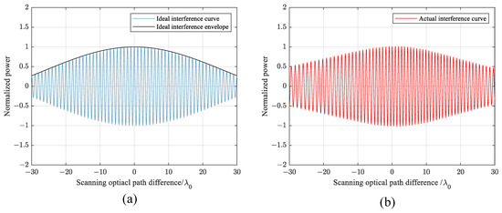 where is the light intensity of the two rays of lights, is fringe visibility, and is the optical path difference between two rays of lights. As shown in Figure 14a, the ideal interference envelope is a sinc curve after removing the direct current component.