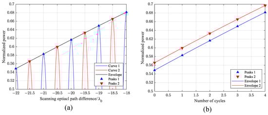 In the actual experiment, the non-ideal light intensity distribution, the dispersion effect caused by long optical fiber, the vibration of the optical fiber, and the noise change the shape of the interference curve, as shown in Figure 14b. The non-ideal light source and dispersion effect reduce the extreme value of the envelope and increase the distance of the first zero point. The vibration of the optical fiber introduces additional random phase difference changes, resulting in the scanning time no longer linearly corresponding to the actual optical path difference changes. The phase difference between each peak in the curve is a period, so this paper calculates the phase difference between different interference curves using the peaks of the interference curve after low pass filtering and normalization.