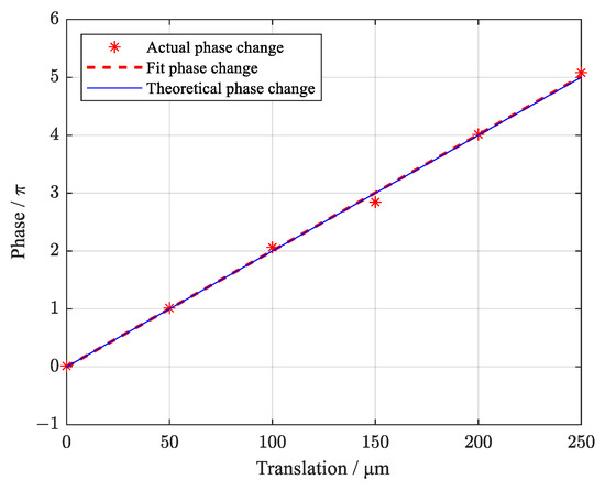A grating pattern with a side length of 2 mm and the light and dark stripe width of 50 μm respectively is used as the target. The fiber collimators are set with a distance of and obtain a distance of from the target. Translate the target in the direction parallel to the interference baseline by to change the distance between the midpoint of fiber collimators and the optical axis. The phase change caused by the translation is:
