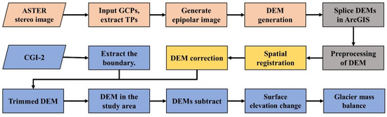 As is shown in Figure 3, the extracted glacier surface elevation mainly included four main steps: (1) generation of DEMs; (2) pretreatment of ASTER DEMs; (3) spatial registration of ASTER DEMs; and (4) calculation of glacier surface elevation variation. In this paper, ASTER images with cloud cover of less than 10% in the Ulugh Muztagh Mountains from 2000 to 2020 were used.