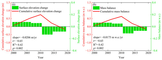 The elevation changes of glaciers were calculated in the Ulugh Muztagh Mountains from 2000 to 2020 based on the glacier DEM in the specific year. As shown in Figure 4, the glacier surface elevation showed an overall decreasing trend characterized by a cumulative elevation change of −0.17 ± 10.74 m from 2000 to 2020 (Table 6). During the study period, the annual change in the glacier elevation ranged from −0.13 ± 2.94 m to 0.07 ± 1.57 m, with an average elevation change of −0.0085 ± 0.54 m/yr. Moreover, the annual glacier mass balance ranged from −0.11 ± 2.50 m w.e. to 0.06 ±1.33 m w.e., with an average annual mass balance of −0.0072 ± 0.46 m w.e./yr during the period. It was noted that the glacier surface mass balance was accumulated from 2000 to 2011 with an accumulative mass balance of 0.64 ± 9.22 m w.e. The glaciers began to lose mass from 2011 to 2020, during which time the accumulative mass balance was −0.78 ± 9.04 m w.e. The mass balance of the glacier showed a decreasing trend, with an accumulative mass balance of −0.14 ± 9.13 m w.e. from 2000 to 2020.
