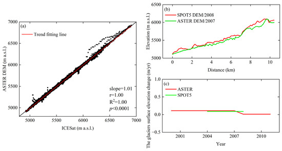 (a) Comparison of selected intersection points in the ICESat and ASTER corresponding points. (b) The elevation profiles of SPOT 5 DEM and ASTER DEM at the same location. (c) Changes in glacier surface elevation of ASTER and SPOT 5.