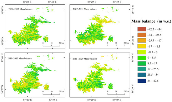 As shown in Figure 6, the glacier surface mass balance difference was very significant in the Ulugh Muztagh Mountains. The mass balance varied from −23.98 m w.e. to 24.06 m w.e. during the period from 2000 to 2020. The glaciers in the north and west showed significant melting, while the glaciers in the east showed relative accumulation. In addition, the accumulation of glaciers occurred in the middle of the study area, and melt could be found in the surrounding area, which was led by the elevation.