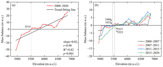 (a) Relationship between glacier surface mass balance and elevation and their regression analysis in the Ulugh Muztagh Mountains for 2000–2020. (b) Relationship between glacier surface mass balance and elevation in the Ulugh Muztagh Mountains for 2000–2007, 2007–2011, 2011–2015, 2015–2020.