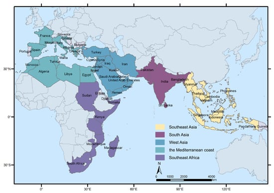 The study area encompasses 3 continents, 13 typical coastal areas, and over 50 countries or regions, with broad spatial scales and significant regional distinction (Figure 1). The countries selected for this study are mainly along the coastal zones of Eurasia and African continents. It was divided into five regions, including Southeast Asia, South Asia, West Asia, the Mediterranean coast, as well as Southeast Africa. Countries with long coastlines, such as Indonesia, the Philippines, Malaysia, and Vietnam, are also included. Most countries and regions are sensitive in the context of climate and geological changes, with very complex natural and fragile ecological environments []. Southeast Asia, one of the most biologically diverse and rich regions in the world, is also included, which is affected by typhoons and flooding annually.