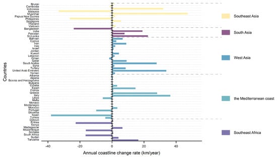 Figure 4 shows the average annual rate of coastline change for each country from 1990–2020. In Southeast Asia, the coastlines of Indonesia and Myanmar are growing rapidly, with an average annual growth rate of 31.8 km/year and 47.2 km/year, respectively, while the coastlines of Malaysia and the Philippines are decreasing with an average annual rate of change of −33.1 km/year and −26.2 km/year. The coastline of countries in Southeast Asia is more variable, with an average annual rate of change of −23.8 km/year for the coastline of Bangladesh and −23.8 km/year for the coastlines of India. Most countries in the West Asia region have positive average annual rates of coastline change, with Saudi Arabia and the United Arab Emirates at 27.7 km/year and 33.8 km/year, respectively. In the Mediterranean region, Greece and Italy have higher average annual coastline growth rates of 28.1 km/year and 36.3 km/year, respectively, while the coastline of Spain shows a greater decrease with an average annual rate of change of −37.9 km/year. Most of the countries in Southeast Africa show a decrease in the coastline, with Eritrea, Mozambique, and South Africa showing average annual rates of change of −22.6 km/year, −16.2 km/year, and −16.4 km/year.