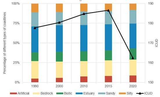 The ICUD index reflects the degree of influence of human activity on the coastline. Figure 6 shows a continuous increase in ICUD from 177.7 in 1990 to 186.6 in 2015, which shows that more and more coastlines were affected by human activities. However, it had a dramatic drop in 2020, reaching 162.5, implying that the coastlines became less affected by anthropogenic events, which corresponds with a significant increase in the biotic coastline between 2015 and 2020.