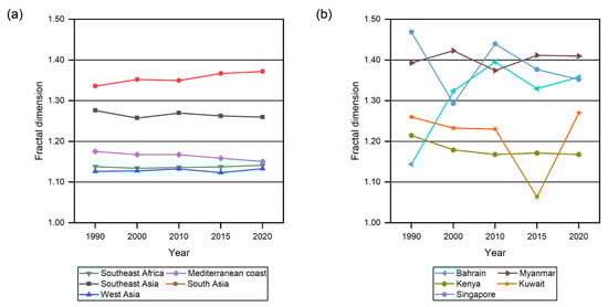 It is estimated that about 3 million hectares of global mangrove area were lost between 1980 and 2005, the largest proportion in Southeast Asia, where about 50% of the mangroves were lost; the area from which mangroves were lost was mainly converted to aquaculture or agriculture, and the others were lost due to urban development [,,]. The reduction in the biotic coastline is concentrated in some countries in Southeast Asia. Large aquaculture countries, such as Thailand and Myanmar, need to balance their aquaculture and coastal zone area conservation. Few studies have used fractal dimensional to estimate coastline change. As with the FD values calculated in this study, the West Asia region has the lowest average FD in almost all study areas. When combined with Figure 7, it is obvious that the coastal zone areas in West Asia, on the other hand, are mainly used for port expansion and maritime trade; these activities are prone to sediment accumulation and tides, which threaten urban life, so a balance should also be established between economic development brought about by artificial coastlines and comfortable living space for humans []. A series of serious problems, such as sea level rise, seawater flooding, dike construction, cyclones, and the degradation of mangroves are problems that need to be solved to protect the coastal zone area [], and we still need a lot of effort to solve these issues and conserve the coastal zone.