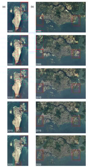 Landsat images of coastlines in the area with large fluctuations in FD values during 1990 and 2020: (a) the Bahrain coastal zone area, (b) the area along the Singapore coastal zone. Areas with great changes are circled in the red box.