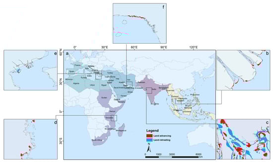 The areas with large changes in land-sea patterns are mainly distributed in South Asia and Southeast Asia. Most of the countries in Southeast Asia showed a net increase in land area in coastal areas. Indonesia, the Philippines, and Vietnam showed a land advance with a net increase of about 2223.88 km2, 863.22 km2, and 419.42 km2 (Figure 9b). In South Asia, Bangladesh showed a net increase in land area of 222.49 km2, India showed a retreat of land area with a net change of −512.61 km2, and Pakistan had a significant change of the land area of about −561.71 km2 (Figure 9c). Many countries in Southeast Africa maintained a slight change in coastline area, showing a slight erosion (Figure 9d). Among the Mediterranean coastal countries, Egypt and Greece suffered coastal erosion, with land retreating of area change of −23.28 km2 and −11.74 km2, respectively (Figure 9e). Most countries in West Asia remained a net increase in land area, with Iran showing the largest increase of area of about 292.29 km2 and Turkey of about 196.44 km2 (Figure 9f).