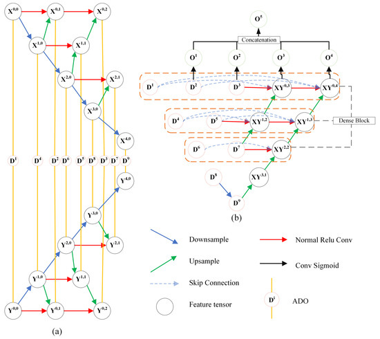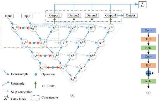 Figure 6. The network structure of NestNet. (a) Downsampling module, (b) Upsampling module.