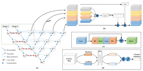 Figure 5. The network structure of SNUNet-CD. (a) backbone of SNUNet-CD, (b) Ensemble Channel Attention Module, (c) Convolution Block, (d) Channel Attention Module (CAM). - 6.