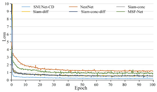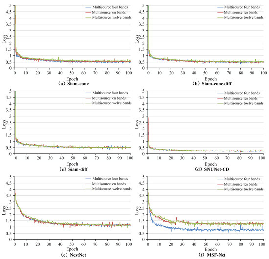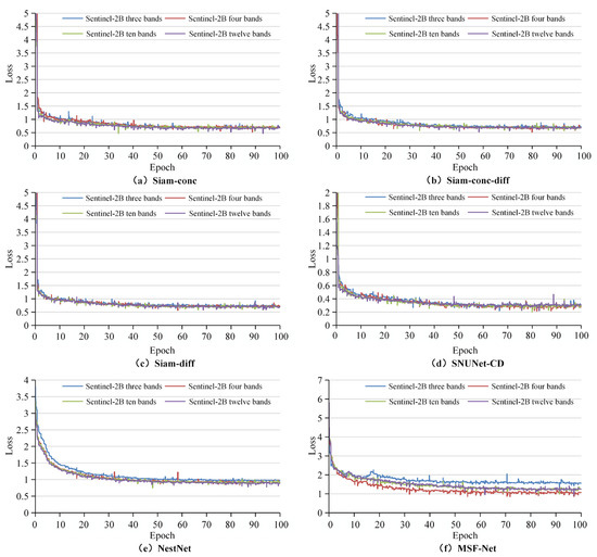 Using the annotated MS-HS BCD dataset, building change detection of single-source multispectral images are investigated and experiments are conducted using six network models based on the four multispectral band combinations designed (Table 4, Table 5, Table 6 and Table 7). The training loss curves for the six network structures are shown in Figure 9; NestNet and MSF-Net remained flat after epoch60 and the other models remained flat after epoch50. The detection results are shown in Table 13, Table 14, Table 15, Table 16, Table 17 and Table 18.