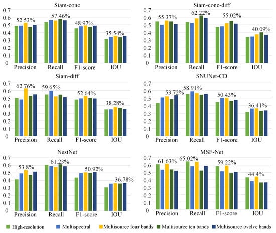 In order to more significantly represent the variation in each model evaluation metric with data source, we organized the results of the Table 19, Table 20, Table 21, Table 22, Table 23 and Table 24 into a bar chart, as shown in Figure 17. It is important to note that the multispectral combinations in the Siam-conc, Siam-conc-diff, Siam-diff, SNUNet-CD, NestNet, and MSF-Net are three-, three-, ten-, twelve-, three-, and four-bands combination, respectively. The data combinations of high-resolution, multisource four bands, multisource ten bands, multisource twelve bands are shown in Table 3, Table 8, Table 9 and Table 10. It can be concluded that building the change detection based on multisource spectral and texture feature data can effectively improve the detection effect of the algorithm model. Except for the decrease in recall of the Siam-diff, SNUNet-CD. and MSF-Net algorithms, all of the other indices increase to different degrees.