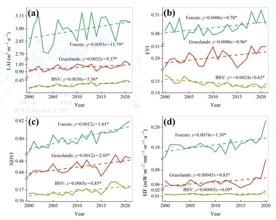 Temporal averages of interannual (a) LAI, (b) EVI, (c) NDVI, and (d) SIF values classified by forests (the green lines), grasslands (the red lines), and barren or sparsely vegetated (BSV) areas (the brown lines). The linear fit line along with its regression equation are presented for each case. The symbol “*” denotes that the regression coefficient passed the significance test (α < 0.05).