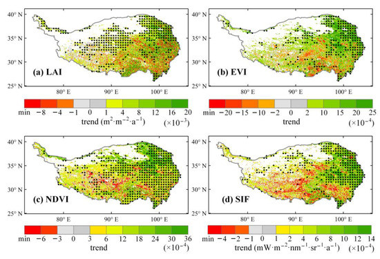 Spatial distribution of the trend values for (a) LAI, (b) EVI, (c) NDVI, and (d) SIF data on the QTP. The black dots denote trend values of corresponding areas that passed the significance test (α < 0.1).
