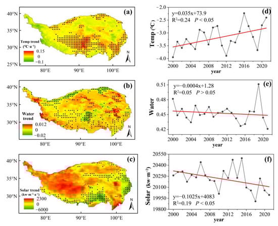 Spatial distribution of the trend values for (a) temperature, (b) water availability, and (c) solar radiation during 2000–2021 on the QTP. The black dots denote trend values for corresponding areas that passed the significance test (p < 0.1). (d–f) show the corresponding interannual variability of the three climate factors by considering the spatial average values for each year.