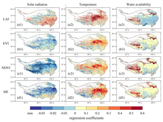 Spatial distribution of regression coefficients derived from the PCR for vegetation sensitivity in response to solar radiation (the first column), temperature (the second column), and water availability (the third column), based on the (a1–a3) LAI, (b1–b3) EVI, (c1–c3) NDVI, and (d1–d3) SIF products. Regression coefficients are dimensionless, since all the vegetation products were seasonally detrended and normalized using their Z-scores before applying them to the PCR.