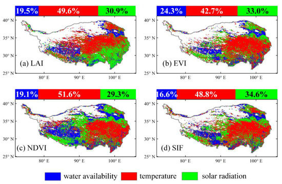 Spatial distribution of the dominant climate factor with the largest regression coefficients. The regression coefficients were intercompared using their absolute values to identify the dominant climate factor. (a–d) represent the evaluation results derived from the LAI, EVI, NDVI, and SIF products, respectively. The bar chart above each subfigure describes the fraction values of red, green, and blue pixels for the whole area.