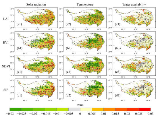 Spatial distribution of trend values for vegetation dynamics in response to solar radiation (the first column), temperature (the second column), and water availability (the third column) based on the (a1–a3) LAI, (b1–b3) EVI, (c1–c3) NDVI, and (d1–d3) SIF products.