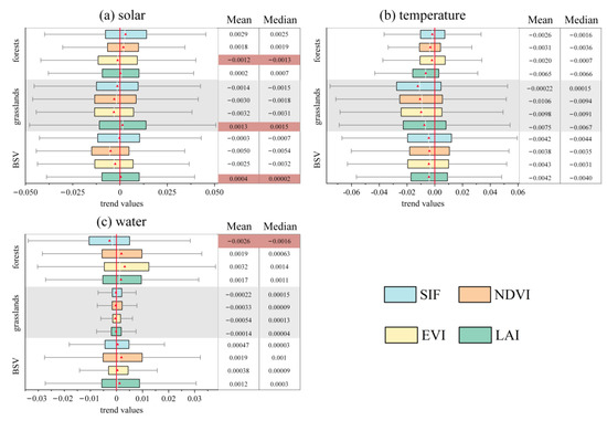 Boxplots of trend values for the vegetation proxies, i.e., SIF (blue), NDVI (orange), EVI (yellow), and LAI (green), in response to (a) solar radiation, (b) temperature, and (c) water availability. The trend values are further classified by BSVs, grasslands, and forests. Associated mean and median values are shown in the right-hand table next to each subfigure. Cases with an opposite performance, i.e., an opposite trend identified by the mean and median values, are highlighted with red coloring in the table.