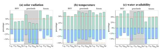 In general, the boxplots in Figure 9a show that solar radiation exerted a negative impact on vegetation in BSVs and grasslands, while it exerted a positive impact on vegetation in forests. Figure 9b illustrates that temperature generally had a negative impact on all three land-cover types. By contrast, water availability displayed a positive impact on BSVs and grasslands (Figure 9c). Nevertheless, no obvious sign of the regression coefficients could be determined for forests. Taking all four vegetation proxies into consideration, we further summarized the trend of vegetation sensitivity illustrated in Figure 8 and corresponding signs of the regression coefficients displayed in Figure 9. The conclusions are shown in Table 1.